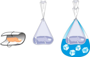 - Bekertje of zakje vullen met water en enkele ijsblokjes.